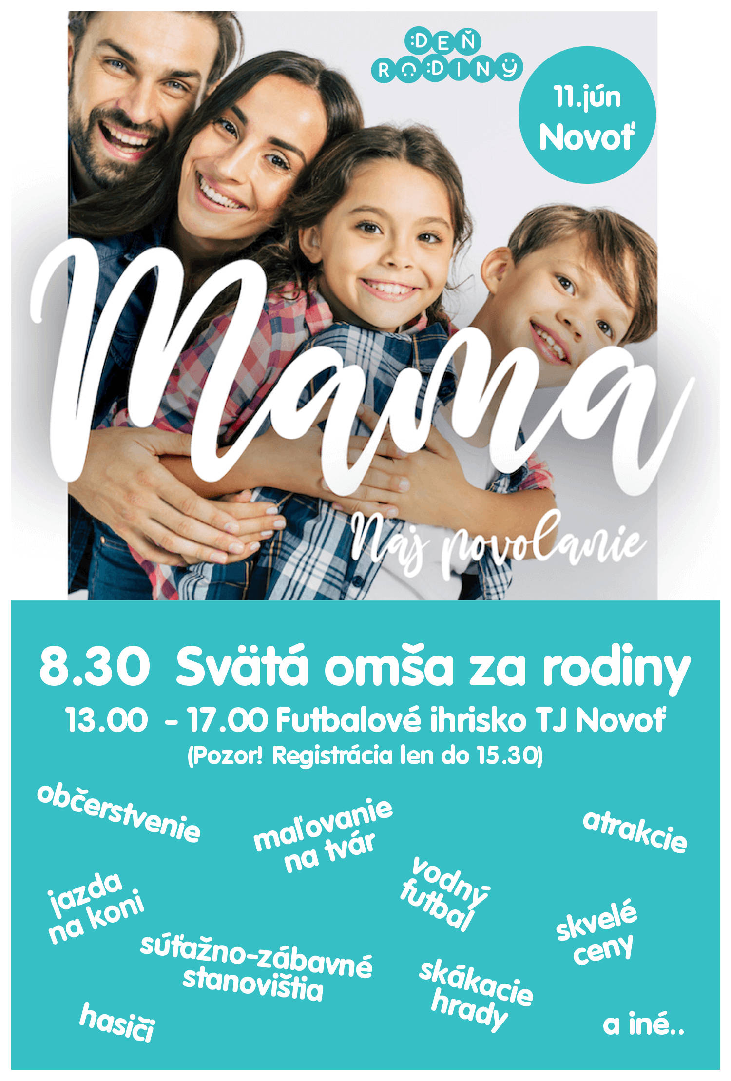 Pozývame Vás spoločne s nami osláviť Deň rodiny 2023. Témou tohto ročníka je Mama – naj povolanie. Tento rok by sme radi vyzdvihli všetko, čo pre nás a pre naše rodiny robia mamy. Chceme vyzdvihnúť, oceniť a uznať náročné povolanie matky a poďakovať sa za všetko, čo robia pre naše rodiny a celú spoločnosť.