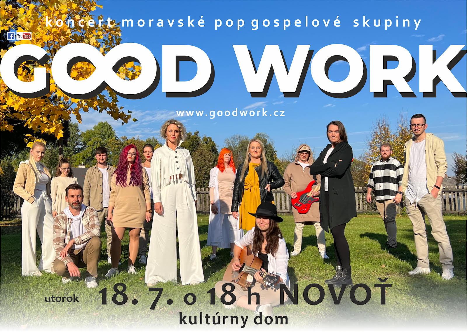 Tento utorok 18. júla 2023 o 18:00 bude v sále  Kultúrneho domu koncert českej kresťanskej skupiny GOODWORK. (sv. omša je o 15:00)