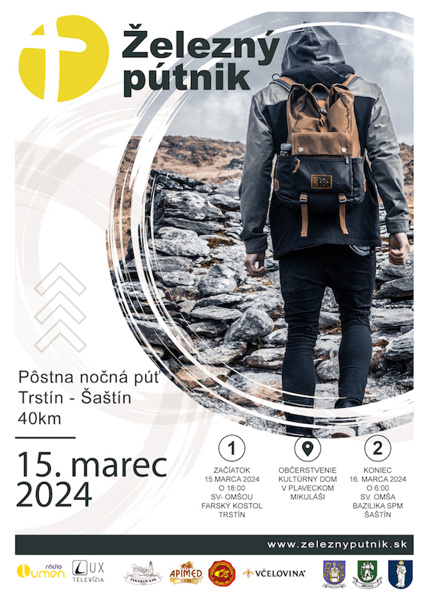 Pozývame vás na 3. ročník Żelezného pútnika, ktorý sa uskutoční 15. marca o 18. tej hodine. Ide o pôstnu pešiu nočná púť z Trstína Hájička do národnej baziliky v Šaštíne. Jej dľžka je niečo vyše 40 km. Koná sa za každého počasia.