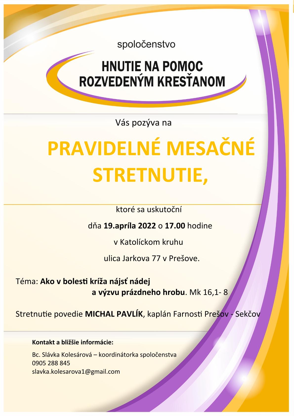 Spoločenstvo Hnutie na pomoc rozvedeným kresťanom  Vás pozýva na pravidelné mesačné stretnutie, ktoré sa uskutoční dňa 19.apríla 2022 17.00 hodine v Katolíckom kruhu, ulica Jarkova 77 v Prešove.